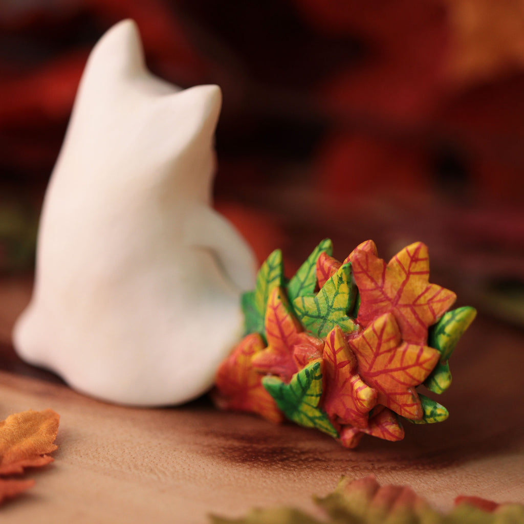 This whimsical kitty ghost was hand sculpted in a lightweight clay. Each leaf was hand sculpted in flexible clay. This piece has been meticulously hand painted and sealed with a protective varnish. The light orange highlights on the kitty are meant to give the look of warm autumn sunlight. This figurine stands at about 2 inches tall.