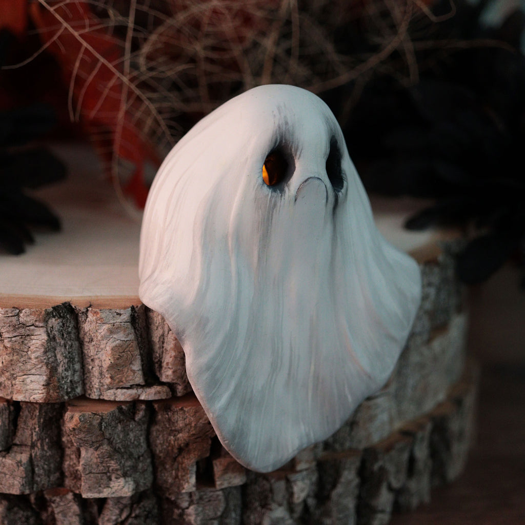 This figurine was hand sculpted in a lightweight clay. It has been hand painted and sealed with a protective varnish. The inside is hollow and holds a small battery powered tea light. This piece is meant to sit nestled on the edge of a table, shelf, or ledge. It measures about 4 inches.