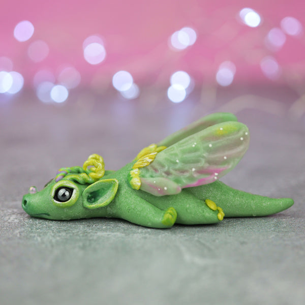 This dragon was hand sculpted and hand painted. The body has glass glitter embedded and baked into it. The wings are flexible and translucent. This sparkly dragon has a faceted tourmaline stone in its forehead and it balances a tiny glass ball on its nose. This piece measures about 3 inches long. It is one of a kind.
