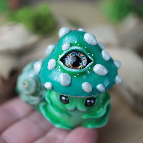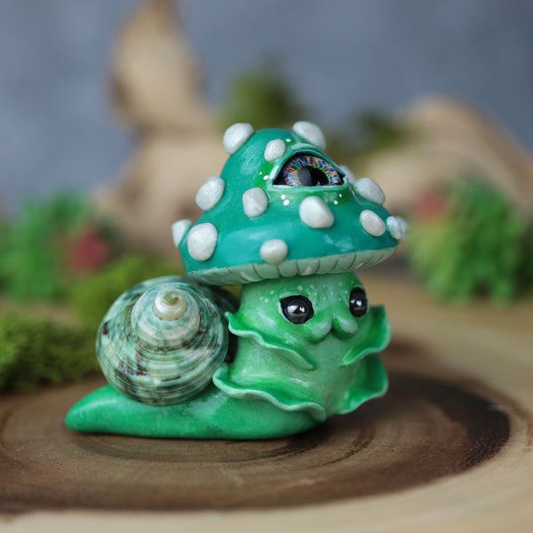 This figurine was hand sculpted, hand painted, and sealed with several layers of a protective varnish. Embedded in the mushroom is a glass eye and the shell is a real snail shell. This figurine measures about 2 by 2 inches.