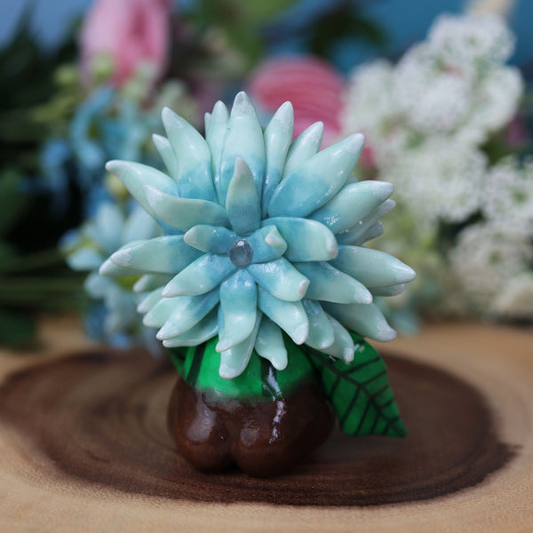 This grumpy blue flower was hand sculpted, hand painted, and sealed with several layers of a protective varnish. Embedded in the back of the flower is a faceted tanzanite gem. This piece measures around 2 3/4 inches tall.