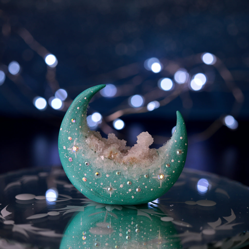 This moon was sculpted in Cosclay, hand painted, and sealed with a protective varnish. It has a geode chunk embedded, glass rhinestones, and glass glitter. It measures about 2 tall by 2 inches wide.