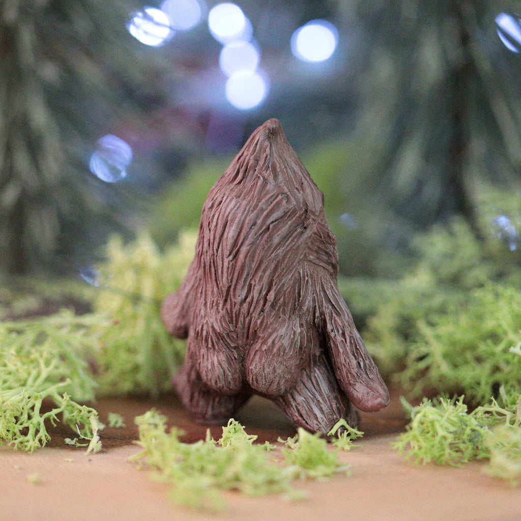 This sasquatch was hand sculpted, hand painted, and sealed with a protective varnish. The fur is sculpted and painted, making it extra hairy looking. This one stands at about 2 inches tall.